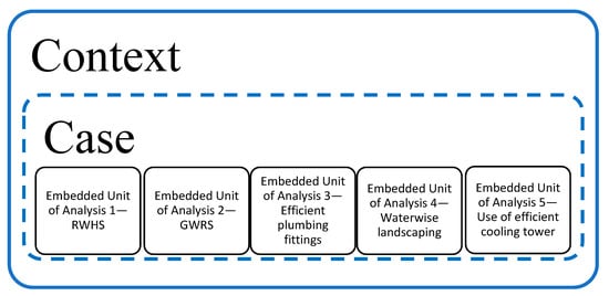 According to Schramm (1971), the primary objective of a case study is to illuminate a decision or series of decisions by understanding the reasons behind them, their implementation and their outcomes [63]. This study illuminates the decisions to implement strategies for enhancing water efficiency in office buildings in tropical climates, understanding the reasons behind these decisions. It then implements the strategies and reports the outcomes. Thus, this study adheres to the stated objectives. The researcher investigated the potential for enhancing water consumption efficiency through green initiatives, as suggested by multiple case studies in the literature. The outcomes of these initiatives were then analyzed and presented. Given that the case study building includes multiple sub-units of analysis, the methodology of an embedded single case study was applied. This concept is illustrated in Figure 2.