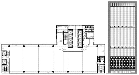 The primary purpose of the building is to provide office spaces for rent. The structure comprises 4 basement levels dedicated to services and parking, 2 levels encompassing commercial areas (ground and upper ground), 7 elevated parking floors, 22 floors designated for offices, 1 floor dedicated to recreation, and finally, a rooftop restaurant and club. The total floor area of the proposed building is approximately 45,000 m2. It is estimated that the building will accommodate a population of around 1500 individuals including visitors: 324 per day. A typical floor layout and the front elevation of the proposed office building is presented in Figure 4.