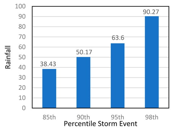 Based on the historical rainfall data (from 6 May 2008 to 28 April 2018), the results of the calculated percentile rainfall values are shown below in Figure 5. The rainfall at the 95th percentile is 63.6 mm and is used for determining the tank capacity for rainwater collection [66]. The total volume of runoff was calculated using Equation (1), and the total volume of runoff is estimated as 130.21 m3. In the above calculation, the roof area was used to determine the volume of rainwater collected on the rooftop, and the garden area was used to calculate the volume for the groundwater collection tank. However, it should be noted that rainfall from an additional area at ground level is collected due to the topography of the land, which is approximately equivalent to the vegetation on the ground level. The garden consists of concrete surfaces and concrete paving. In the calculation, the surface runoff coefficient was taken as 0.95 for concrete [66,77]. Hence, the volume of the roof and ground rainwater tank sizes were determined as 45 m3 and 90 m3 of which the summation is slightly higher than 130 m3.
