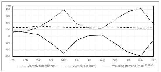 The peak watering month at the project location was ascertained by using monthly rainfall and evapotranspiration data, and the result of the baseline water requirement is presented in Figure 6 below. Rainfall data covering the years 2008 to 2019 were utilized to calculate the monthly average rainfall for a landscape area of 1481.8 m2. Monthly average ET0 data were determined using information from a 30-year period spanning from 1961 to 1990. ET0 represents an evapotranspiration rate from a consistently well-watered, large uniform grass field (reference surface), with the crop covering the soil, maintained short and nurtured under optimal agricultural conditions [75]. According to Figure 6, the peak watering month is January and the peak watering demand is 72 mm. Moreover, the landscape water allowance is 135,051 L/month and the landscape water baseline is 192,930 L/month. Both the landscape water allowance and landscape water baseline were determined based on the ET0 value for the peak watering month. The peak watering ET0 is 130.2 mm.