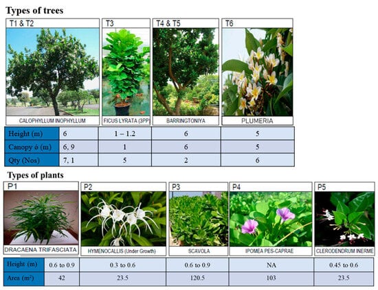 The required water demand for the case study was optimized dramatically by altering the irrigation demand through carefully selecting plants that do not require much water to survive and are appropriate for their intended uses. The schedule of selected trees is presented in Figure 7 including the heights and canopy areas. There are six types of trees (T1 to T6) and five types of plants (P1 to P5) selected for the case study building. The details of the vegetation areas are presented in Table 3. The highest vegetation footprint is located on the ground floor and is 303 m2. The reasons for selecting the above-stated plans and trees are supported by the literature and presented in the Supplementary Materials—Table S5. All the selected trees; Calophyllum Inophyllum, Ficus Lyrata, Barringtonia and Plumeria are drought-tolerant and can survive for several months without water. Additionally, the five selected plants flower reasonably throughout the year and are well-suited to a hot, humid climate.