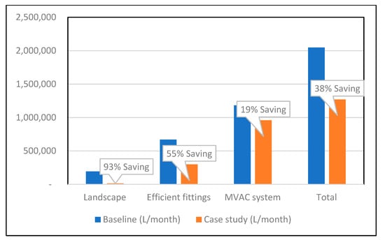 On the other hand, [14] stated that the expenditures of electricity, heating, gas, water and sewage disposal make up the majority of the utility costs in an office building in a case study conducted in Poland, a temperate country. A case study conducted by [15] in Indonesia (a tropical country) confirmed that the annual water consumption of an office building can be reduced from 124,200 m3/year to 19,320 m3/year by implementing a green approach, i.e., an 84% improvement in water consumption. In line with the above, [16] stated that green building construction is being implemented across different countries as a way of reducing the water footprint in addition to the energy consumption of the building. Furthermore, the review study confirmed that the reduction in the water footprint is about 20% in green buildings in comparison to the baseline building [16]. Furthermore, [17] already confirmed the aforementioned statement by conducting a study in Brazil using big data, which revealed the installation of dual-flush toilets, reuse of greywater and use of rainwater helped to reduce potable water consumption by 30%, 53.4% and 60.3%, respectively. Furthermore, the research confirmed that a substantial reduction in electrical energy consumption can be achieved by minimizing water usage.