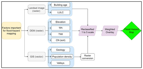 In this study, the focus is on flood hazard maps (identification of areas that might be potentially flooded). Our flood-hazard map was generated by a weighted overlay of factors that are important for assessing flood susceptibility (Figure 4). These factors include building age, elevation, land use, geology, topographic position index (TPI), curve number (CN), topographic wetness index (TWI), population density, and proximity to a valley. We discuss each of these factors in more detail below. We excluded rainfall as a factor because the average rainfall within the study area ranges from 3 mm to 11 mm and does not vary spatially within the study area.