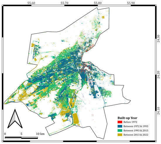 We classified the built-up areas derived from the LULC map into four distinct categories based on the construction periods of the buildings. Specifically, these four groups were as follows: buildings constructed before 1972, between 1972 and 1993, between 1993 and 2013, and between 2013 and 2022 (Figure 5). The oldest buildings are concentrated in the city center and northeast of the study area, whereas the newer ones are located around the periphery of the city (Figure 4).