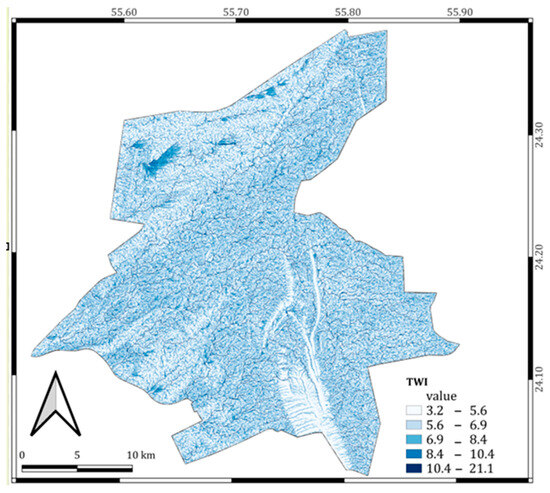The high TWI values correspond to the drainage systems in the study area and to the zones with high flood hazards (Figure 6). Hence, TWI values alone could be used to delineate flood-prone regions [59] because they incorporate elevation, slope, flow direction, and flow accumulation. Indeed, Papaioannou et al. [7] established that TWI is the most significant index/factor, followed closely by CN.