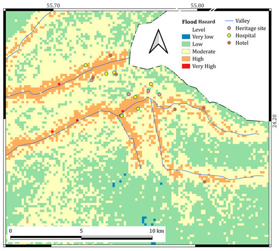 After assigning weights to each contributing factor, we used the weighted overlay function in Arc Map to generate a comprehensive flood-hazard map. The results revealed that the areas with the highest flood hazards are concentrated within the primary valleys that extend from the east to the west through Al Ain city. A similar study that used a land-morphology approach to study flood risk in Portugal highlighted floodplains adjacent to streams as being prone to flooding [60]. In the same vein, research performed in the Lam River basin (Vietnam) revealed that—based on multigeospatial hazard mapping—areas along rivers and streams are high-flood-hazard areas [4]. Another study assessed the damage caused to settlements in proximity to Dir Valley in Pakistan, which included human causality and ranged from partial to complete destruction of buildings, infrastructure, and agricultural land [61]. Conversely, we identified regions located along the periphery of Al Ain city, which are predominantly covered by desert, as having low flood potential. We also found that the Jebel Hafit Mountain has a minimal risk of flooding, ensuring its safety and stability. Significant historical sites are nestled in the eastern part of the Hafit Mountain range. Among these are remarkable beehive tombs, which date back 5000 years [62]. The airport, situated away from the main valleys, falls within the medium-risk category for potential flooding incidents.