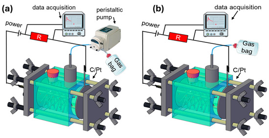 Single-chamber cubic microbial electrolysis cells (MECs) made of Plexiglas with a working volume of 25 mL (L: 40 mm × Φ: 30 mm) were used in this investigation [21]. The carbon fiber brush (Φ: 30 mm × L: 25 mm) was used as the anode, and Pt/C-coated carbon cloth (7 cm2) was employed as the cathode. The anodes were pretreated by soaking in absolute acetone for 24 h to remove surface impurities and then heated to 450 °C for 30 min in a muffle oven (KLS-1200X; Hefei Kejing Material Technology Co., Ltd., Hefei, China) [22]. Cathodes were prepared with one-sided-wet-proofed carbon cloth (B1B30WP; 30% wet proofing; E-Tek DivisionSM, Guagdong, China), which was coated with 0.5 mg/cm2 of platinum catalyst (Hesen, Shanghai, China) and Nafion (5%) binder on the water-facing side [23]. The air-facing side of the cathodes was sealed with a Plexiglas plate (thickness: 5 mm) to prevent oxygen intrusion [24]. The produced gases were extracted by two different modes: rapid gas harvesting mode by using vacuum (negative-pressure mode (N)) and spontaneous gas release mode (passive mode). Gas outlets were directly connected to the gas bag in passive mode, while gas outlets were connected to the gas bag through a peristaltic pump (BT100-1L; Langer pPump Co., Ltd., Hebei, China) at 50 rpm to harvest gases in negative-pressure mode (Figure 1). The anodes and cathodes of the MECs were connected with power supply (DC power output of 0–12 V and AC input of 220 V ± 20%; Shanghai Fudan Tianxin Science and Education Instrument Co., Ltd., Shanghai, China) via copper wires, and the output of electrical signals across the 10 Ω resistance was obtained by a data acquisition board (PISO-813; ICI DAS Co., Ltd., Taiwan, China) every 30 min throughout the experiment. The duration of every batch cycle was 24 h. All the experiments were performed with an applied voltage of 0.8 V at 30 °C in duplicate.