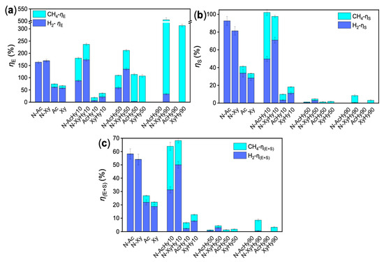 Negative pressure showed a strong significance in the overall performance of the MECs. The energy efficiency () was determined by biogas (H2 + CH4) evolution in the MECs. The energy efficiency based on the electricity input () was always higher in negative-pressure MECs and the highest in the xylose-enriched MECs (Figure 2a). The highest related to H2 evolution was observed as 173.15 ± 5.08% in N-XyHy10, which was eight times that of XyHy10, while the highest related to biogas was 505.34 ± 12.28%, achieved in N-XyHy90. Energy efficiency based on the consumed substrate () decreased in all MECs with the substrate concentration increase from Hy10 to Hy90 (Figure 2b). However, negative pressure achieved higher than passive pressure, where N-XyHy10 achieved the highest efficiency of 97.67 ± 4.42%, which was five times greater than that of XyHy10 (18.23 ± 1.72%). Similar to , the overall energy efficiency () of the MECs was always higher under negative pressure at different substrate concentrations. Similar to the above results, the xylose-enriched MECs played a significant role in utilizing hydrolysate as a substrate, with the highest efficiency of 68.28 ± 4.26% for N-XyHy10 under negative pressure, which was 540% of that of XyHy10.