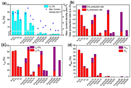 (a) Coulombic efficiency and maximum current density; (b) total biogas production rate, including methane and hydrogen; (c) cathodic gas recovery, including cathodic H2 (−CH4) and CH4 (rCAT−H2) recovery; and (d) total gas recovery (; combination of total CH4 recovery and total H2 recovery ) of startup for Hy90-fed MECs.