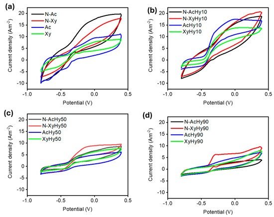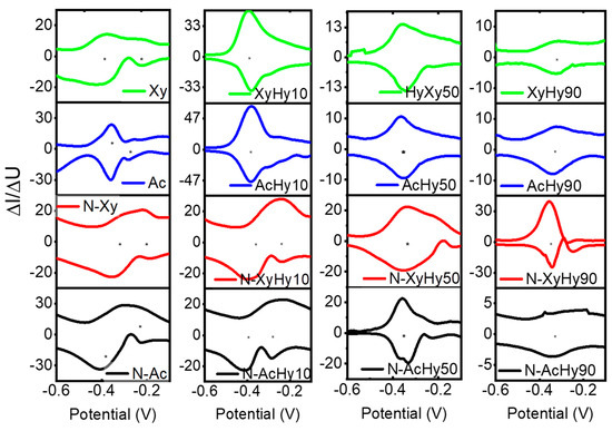 CV and DPV were performed to investigate the behavior and electrochemical activities of bioanode with different substrates. A typical sigmoidal CV (Figure 4) was obtained as indicative of catalytic oxidation of the substrate by the biofilm and electron transfer to the electrode. Compared with Ac and AcHy10, the catalytic current densities were lower in Xy and XyHy10 (10.29 and 16.70, and 8.59 and 13.64 Am−2, respectively). On the other hand, the catalytic current densities of XyHy50 and XyHy90 were higher than those of AcHy50 and AcHy90. The electroactive sites of the biofilm were further characterized by DCV (Figure 5). The maxima in the derivative curve were observed at −355 and −328 mV for Ac and Xy, respectively. When the substrate was changed to hydrolysate, a similar redox center was observed for the electrochemical reaction of both MEC types (Xy-enriched or Ac-enriched). The electroactive site of both MEC types shifted to 385 ± 4, 356 ± 2, and 323 ± 3 mV for Hy10, -50, and -90, respectively (Table S2). This result indicates that hydrolysate formed a similar redox center for the electrochemical reaction of the biofilm and hydrolysate oxidation.