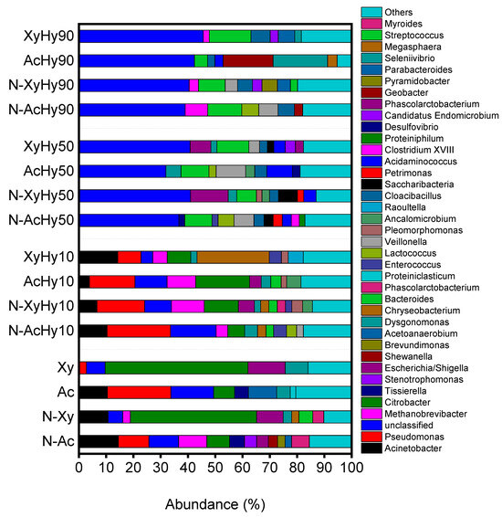 At the phylum level (Figure S2a), all the anodic biofilms presented three major taxa, which were dominated by Proteobacteria with relative abundances of 51.89 and 56.59% for acetate-enriched anodes Ac and N-Ac, respectively, and 77.5 and 72.98% for xylose-enriched anodes Xy and N-Xy, respectively, as electroactive bacteria, followed by fermentative bacteria Bacteroidetes (12–16%) and Firmicutes (8–27%) during enrichment [33]. With respect to the Hy concentration, the average relative abundance of Proteobacteria decreased (4–20%), whereas the abundances of fermentative bacteria increased to 38–48% and 16–28% for Firmicutes and Bacteroidetes, respectively, at the end of the experiment (Hy90 feed). However, we observed the presence of Euryarchaeota in negative-pressure-applied MECs, with an average relative abundance of 10% from the beginning to the end of the experiment.