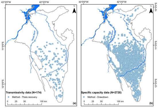 Location of the pumping wells used in this study. (a) Wells with data from the CERB database used for calculating T using Theis’s recovery method (1935) [3] and determining Sc values. (b) Wells with Sc data from the SGB database.