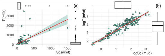 LogT and logSc showed a strong linear correlation (Figure 3b), as indicated by the coefficient of determination R2 = 0.86 (p < 2.2 × 10−16). The strong correlation shown in Figure 3b can be used to estimate values of empirical transmissivities Temp, as shown in Equation (3). Strong correlations between the described variables, as well as empirical models, have also been observed in other karst aquifers [12,50,51].