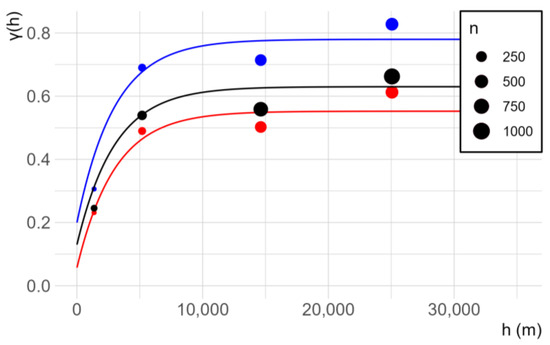 Experimental variograms (circles) and theoretical variograms (fitted lines). The variograms of logT, logSc, and logT × logSc are represented in blue, red, and black, respectively.