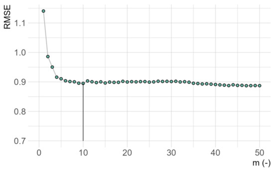 Ordinary co-kriging (CO-OK) was performed, as presented in Equation (2), where we used the cross-variogram shown in Figure 4 and the optimal number of neighboring wells (m). The estimation of m was carried out through the cross-validation presented in Figure 5, where we obtained m = 10 and an RMSE of 0.9 for the logT values. However, the nugget effect of the cross-variogram showed an intermediate degree of randomness.