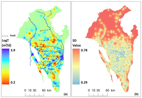 Interpolation of (a) logT by ordinary co-kriging, (b) standard deviation associated with the interpolations.