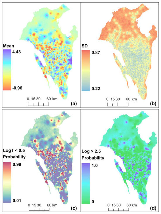 Figure 8c shows a map of the probabilities of occurrence of logT < 0.5 m2/d (approximately 3 m2/d), representing the zones with the lowest groundwater potential of the SKA in dark red color. In contrast, the map in Figure 8d illustrates the probabilities of occurrences for logT values greater than 2.5 m2/d, highlighting the areas with the highest groundwater availability in deep blue.