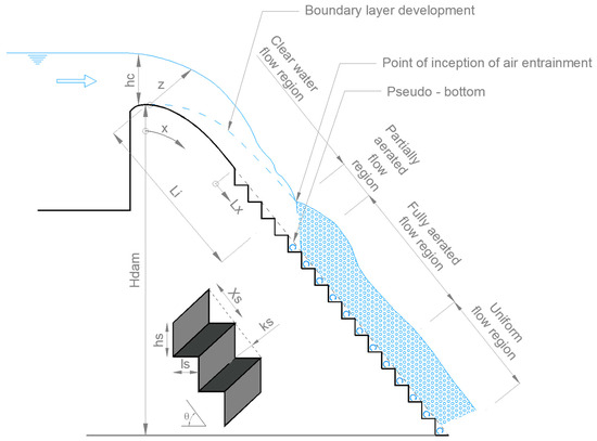 - Chanson, H. Hydraulics of Stepped Chutes and Spillways; Balkema Publ: Lisse, The Netherlands, 2001; ISBN 9058093522. [Google Scholar]