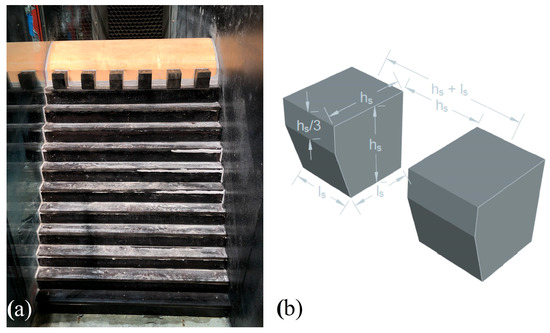 Experiments were conducted both with and without energy-reducing crest splitters. The crest splitters were included to induce additional turbulence near the crest without decreasing the spillway capacity. These crest splitters were inspired by the design criteria outlined by Robert [19], with some modifications to facilitate their implementation in new and existing stepped spillways. The splitters were constructed from wood, as shown in Table 2 and Figure 3. In this study, the experimental results were labeled as “base case” (without splitters) and “with splitters” (with splitters).