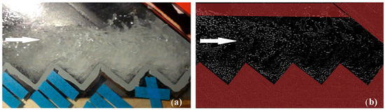 Velocity values were measured for a highly aerated flow over a stepped spillway using the BIV method, which employs air bubbles trapped in the flow as tracers. In Figure 6a, velocity vectors from the BIV analysis can be observed at the maximum discharge of the D-Model base case. No free surface aeration occurred in either C-Model or D-Model under maximum discharge conditions; therefore, bubbles were introduced at the first step to serve as BIV tracers. Figure 6a,b illustrate the phenomenon of circulating vortices in the step cavities. In the BIV analysis, the density of vectors does not represent the density of information in the velocity field; rather, the length of the vector represents the magnitude of the velocity.