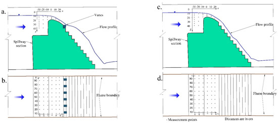Comparison of flow regimes in the (a) D-Model base case (b) D-Model splitters (c) C-Model base case (d) C-Model splitters, at the same normalized critical depth . (Both of the models’ steps are labelled with Roman symbols).