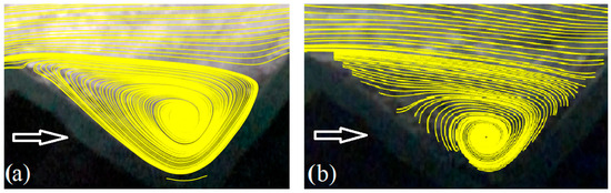 Comparison of streamlines obtained from BIV analysis of (a) base case and (b) splitters configuration in D-Model and flow direction from left to right.