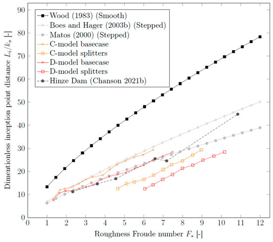 The comparison of the point of inception showed relatively good agreement between the C-Model base case and Boes & Hager [16], as well as between D-Model base case and Matos [26] (Figure 11). The prototype data from the Hinze Dam also closely correspond, particularly with the primary D-Model. When the splitters configuration was added to the models, the inception point distance decreased, resulting in a shift of approximately the dimensionless distance . This indicates that adding the splitters accelerates the growth of the turbulent boundary layer. The base case hydraulic models correlate well with the established empirical relations for the growth of the turbulent boundary layer toward the water surface and the subsequent free-surface aeration.