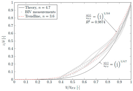 Dimensionless velocity profiles measured with BIV over step edges in D-Model base case compared with power-law approach and .
