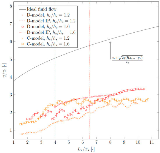 Figure 14 presents a comparison of surface velocities measured with BIV from a top view at and in the C-Model and D-Model for the base case configuration. “IP” corresponds to the inception point, or the location where free-surface aeration begins.