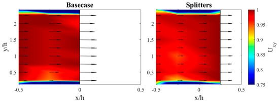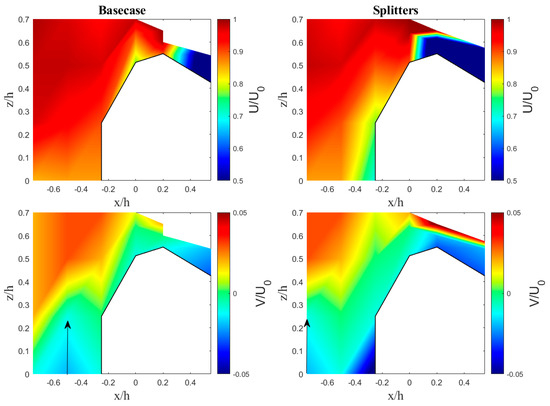 For each data point, the time-averaged components of the velocity vectors were measured and normalized by the average flow velocity . The figures were generated using dimensionless lengths, where h represents the ogee height. The contours of the normalized horizontal velocity components and are shown in Figure 15 for both the base case and splitters configurations. Figure 16 presents contour plots of , along with horizontal velocity vector plots of and the flow surface, displayed on a horizontal plane with a color scheme for both the base case and splitters configurations.