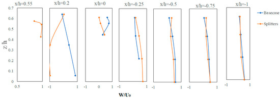 Comparison of normalized vertical one-dimensional profiles for stream-wise locations , and in base case and splitters cases for the D-Model.