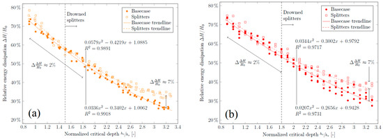 Experimental data of relative energy dissipation compared to normalized critical depth in the (a) C-Model and (b) D-Model.
