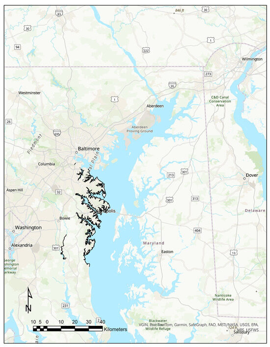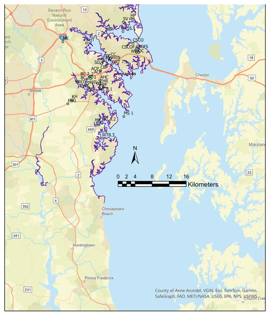Furthermore, rising sea levels, increasing temperatures, and shifts in precipitation patterns associated with climate change have the potential to impact these estuaries profoundly. Rising sea levels threaten low-lying coastal areas, resulting in changes in the hydraulic functions of streams and estuarine dynamics [8], while changes in temperature and weather patterns can affect aquatic habitats and species [9]. These changes may also exacerbate nutrient and sediment inputs into the estuary, fostering spatial growth and temporal extensions of dead zones and resulting in habitat loss [10]. While dead zones are growing in the open ocean, the coastal ocean is experiencing even faster rates of hypoxia [11]. Furthermore, population growth within sub-watersheds increases the demand for resources, land development, and agriculture, straining estuarine ecosystems and water quality. The Chesapeake Bay system, with its shallow water and numerous tributaries, is not exempt from these challenges, which endanger its ability to withstand and recover from various environmental, economic, and social stressors. The Bay’s resiliency to these problems is crucial for habitat sustainability and the region’s economy [12,13,14]. Several studies have documented the importance of tidal creeks as significant sources of nutrient and sediment pollution to their receiving estuary [15,16,17]. Muller and Muller went as far as to suggest that tidal creeks can act as nodal point pollutant sources while creating a sustainability map for the South River sub-estuary of the Chesapeake Bay.