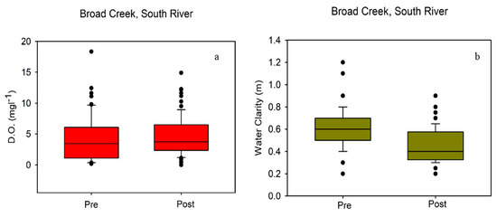 Box plots of pre vs. post-restoration for (a) bottom dissolved oxygen in and (b) water clarity in Broad Creek, South River.