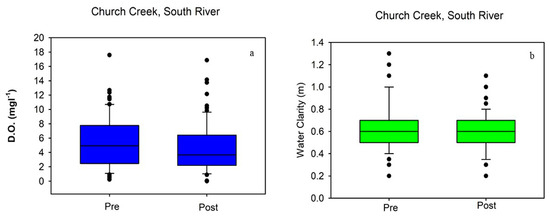Church Creek, South River Pre vs. post box plots for (a) bottom dissolved oxygen and (b) water clarity.
