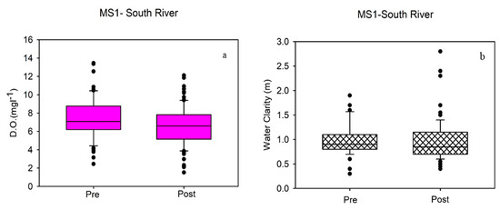Box plots of (a) bottom dissolved oxygen and (b) water clarity pre vs. post-restoration for MS1.