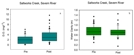 Box plots of pre- and post-restoration for (a) bottom dissolved oxygen and (b) water clarity for Saltworks Creek, Severn River.