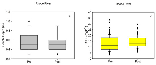 The Rhode River is shallower than the other Lower-Western Shore tributaries and tends to have sustainable bottom dissolved oxygen. As a result, water clarity and total suspended solids (TSS) were examined instead. Results indicated that the water clarity data was non-normally distributed, and the median values were not significantly different (n = 78) (Figure 7a). TSS results also indicated non-normality. Pre-restoration TSS median values were 11.4 mg/L, while post-restoration values were 13.3 mg/L. The t-test results determined that the null hypothesis should be rejected as post-restoration TSS values were significantly higher than pre-restoration values (Figure 7b).
