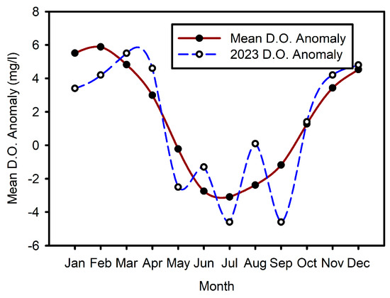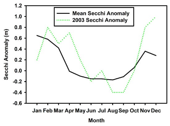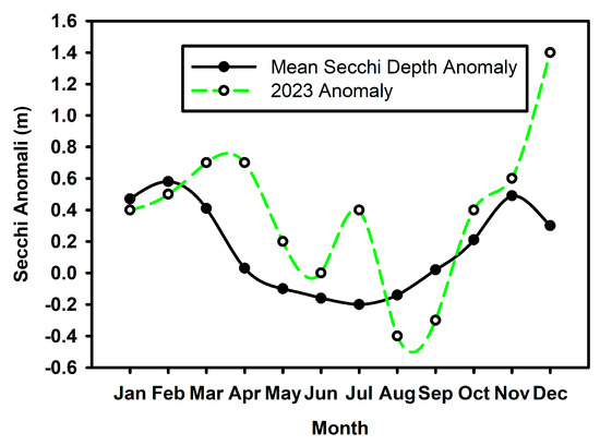 Secchi measurement anomalies were calculated similarly to D.O. anomalies, but the 1 m depth requirement was used instead. The results indicated that water clarity tended to be below the sustainable level for the measuring season. For the 2023 season, only May appeared to be at the sustainable level, as June and October were well below the long-term average, which was already below the sustainable level (Figure 9).
