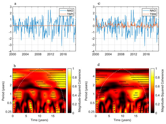 (a). Time-series plot of NAO and total surface Phosphorus Index (TSPT), (b). Wavelet coherence plot for NAO and TSPI, (c). Time-series of NAO and total surface Nitrogen index (TSNI), and (d). wavelet coherence plot for NAO and TSNI in the South River.