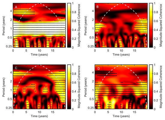 The first occurs around yearly time scales. This is an antiphase relationship that lasted for a short time period, mostly around 2011–2012. More interesting is the two-year periodicity over a longer time period that was in phase. This strong in-phase coherence at two-to-three-year periodicities was consistent with positive phase NAO, causing increases in temperature and precipitation by affecting wind patterns and storm frontogenesis [52,53]. A third weaker antiphase signal was also detected at the 6-month periodicity but was mainly restricted to 2006–2007. ENSO and precipitation anomalies also displayed non-stationary traits; however, the wavelet coherence was weak at best. Angular arrows illustrate a π/2 phase lag.