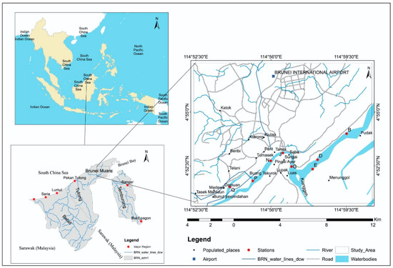 Brunei Darussalam, occupying 5765 km2, is situated on Borneo Island bordered by the South China Sea and surrounded by Malaysia’s Sarawak state [,] (Figure 1). Brunei’s climate is characterized as wet–tropical with average monthly temperatures of 26.7 °C to 27.7 °C, and monthly rainfall of 375 mm []. Seasonal climatic variations are influenced by the stronger northeast monsoon from October to January, and the weaker southeast monsoon from April to August. The rainfall peaks from October to January and May to July, and there is lower rainfall in February, March and June to August. The country landscape predominantly consists of low undulating terrain, with mountainous areas in the southeast []. Its geomorphology was significantly shaped by a major sea-level subsidence event approximately 5000–6000 years ago []. The country’s hydrology is dominated by four major rivers: Belait (209 km), Temburong (98 km), Tutong (137 km) and Brunei (41 km), with the latter two being crucial for the nation’s water supply for domestic, industrial and agricultural uses [,]. The Brunei River is a tidal estuarine river stretching approximately 41 km in length [], flowing through Brunei-Muara district and meandering northeastward until it discharges into the Brunei Bay. The river’s catchment primarily consists of alluvial deposits that overlie the Belait Formation [].