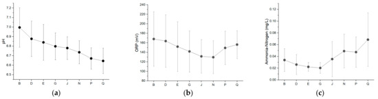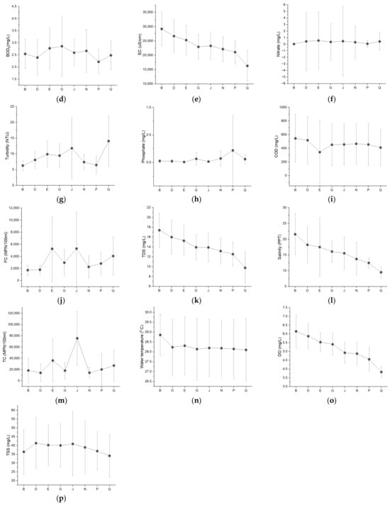 (a–p) Interval plots of pH, water temperature, DO, COD, BOD5, salinity, EC, TDS, turbidity, ORP, TSS, NH3-N, FC, TC, phosphate and NO3– in the eight monitoring stations—B, D, E, G, J, N, P and Q.