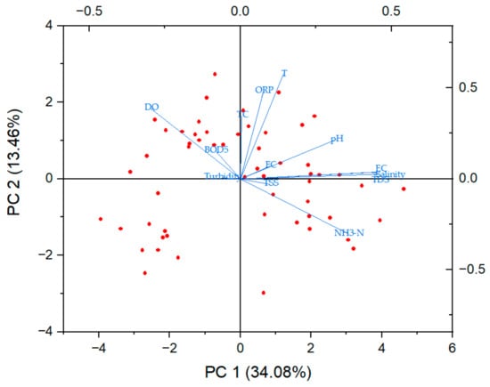 PCA biplot showing the relationship between water quality parameters in PC1 and PC2.