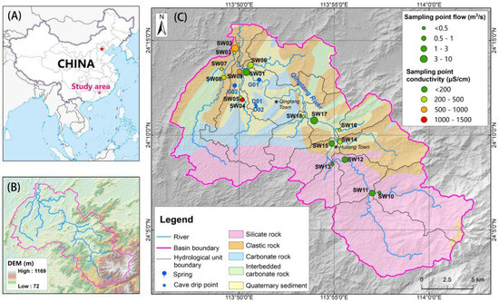The study area mainly consists of a medium to low hilly terrain, with elevations ranging from 72 to 1169 m a.s.l. The terrain gradually decreases in the northwest direction (Figure 1B), and the karst landforms in the middle and lower reaches present a combination of isolated peaks and peak clusters. Forest land is the most extensive, accounting for 72.9%. The arable land is mainly distributed in the Quaternary cover area, accounting for 17.1%, with paddy fields being predominant. The area is silicate rock 44%, carbonate rock 17%, clastic rock 26%, and Quaternary loose sediments 14%. The silicate rock is mainly Middle and Late Jurassic granites, which are formed by quartz, feldspar, and mica. The carbonate rock formations are predominantly thick-bedded limestones of the Lower Carboniferous periods, which are formed by calcite and dolomite. The clastic sequences are chiefly composed of sandstones and shales from the Lower Carboniferous and Upper Devonian periods, which are formed by quartz and clay minerals. The Quaternary sediments consist of sandy clay and sand–gravel layers. The main rock forming minerals are calcite and quartz, and the natural dissolution equations are: CaCO3 + CO2 + H2O → Ca2+ + 2HCO3−, SiO2 + 2CO2 + 2H2O → H2SiO3 + 2H2CO3.