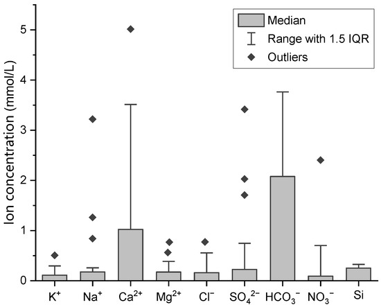 The main physicochemical parameters of surface water and groundwater in the basin are shown in Table 2. The water temperature at each surface water location showed significant variation, with values between 23.29 °C and 28.74 °C, and a median value of 25.01 °C. The water temperature of the cave drip was significantly lower than that of others. The pH value of surface water ranged from 6.44 to 8.05, with a median value of 7.30. The pH value of cave drip water was higher than that of groundwater. Surface water electronic conductivity (EC) lay between 39.9 and 1262.0 μS/cm, with a median value of 275.7 μS/cm, and the high value was contributed by the hydrological unit where SW04 is located. As shown in Figure 1, EC showed a gradual increasing trend from the upstream granite zone to the downstream karst zone. The EC of karst spring G01 in the karst area was significantly higher than that of G02 in the lithological mixed watershed, and the EC of karst cave drip D01 was significantly smaller than that of D02 due to the difference in water–rock interactions resulting from different runoff paths in the karst vadose zone. The cations in each surface water point were dominated by Ca2+ and Na+, and the anions were primarily HCO3− and SO42−. As shown in Figure 2, there were 2 to 3 statistical outliers for each ion, except for HCO3− and dissolved Si, showing the influence of anthropogenic inputs. Ca2+ ranged from 0.106 to 5.017 mmol/L, with a median value of 1.022 mmol/L. Na+ ranged from 0.079 to 3.220 mmol/L, with a median value of 0.176 mmol/L. HCO3− ranged from 0.181 to 3.764 mmol/L, with a median value of 2.078 mmol/L. SO42− ranged from 0.044 to 3.417 mmol/L, with a median value of 0.224 mmol/L. The dissolved Si concentration was generally high, ranging from 0.139 to 0.326 mmol/L, with a median value of 0.251 mmol/L, and was a major contributing factor in the upper part of the basin for the contribution of the large silicate rock distribution area. Both springs and cave drips showed typical karst water characteristics, with significantly high Ca2+ and HCO3− contents. SO42− and NO3− associated with anthropogenic emissions were detected in the collected rainwater samples.