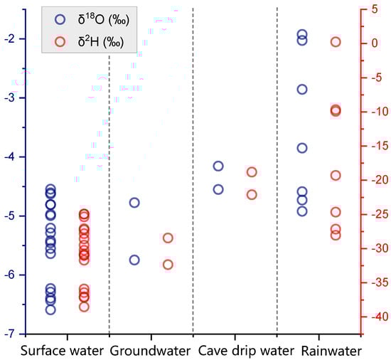 The results of deuterium-oxygen isotopes are illustrated in Figure 3. The δ2H values in surface water ranged from −38.52‰ to −24.99‰, while the δ18O values ranged from −6.59‰ to −4.55‰. In rainwater, the δ2H values ranged from −28.05‰ to 0.24‰, and the δ18O values ranged from −4.92‰ to −1.92‰. The isotope ranges of groundwater and cave drip water for both δ2H and δ18O lay between those of surface water and rainwater.
