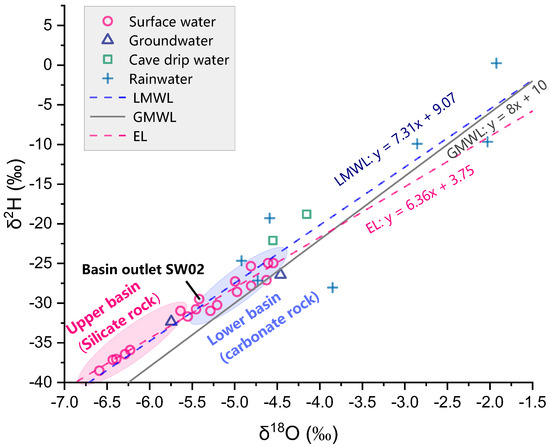 Isotope scatter plots of different water bodies in the basin were created based on δ2H and δ18O isotope results (Figure 4). The local meteoric water line (LMWL: δ2H = 7.82 × δ18O + 7.84) was fitted by rainwater samples, and the points was located above the global meteoric water line (GMWL: δ2H = 8 × δ18O + 10). The surface water evaporation line (EL: δ2H = 6.36 × δ18O + 3.75) was closer to the LMWL, suggesting a relatively swift cycle renewal rate. A distinct zoning pattern was observed in Figure 4 for the upstream and downstream regions of the basin. The upstream area, dominated by silicate rocks, generally displayed more negative isotope values, whereas the downstream area, characterized by carbonate rocks and cave drip waters, aligned more closely with recent rainwater isotope values, indicating that the runoff processes in the downstream karst area were faster by the influence of recent precipitation. The outlet of the watershed (SW02) was situated at the transition between the upstream silicate rock hydrological unit and the downstream carbonate rock hydrological (Figure 4), signifying a confluence of two runoff types with distinct circulation properties. The surface water sampling points were all located in the lower left of the intersection of the EL and the LMWL, suggesting that the general circulation rate of surface water in this watershed is relatively fast, and the surface water isotopes did not show the evaporation fractionation characteristics induced by long-term retention. Groundwater sampling points were arrayed between rainwater and surface water signatures and were proximate to the LMWL, suggesting that, in terms of regional recharge sources and deep groundwater circulation, there was no evidence of extensive long-distance or deep groundwater recharge [33]. Cave drip water points were positioned in the upper right relative to both surface and groundwater, with isotopic signatures akin to rainwater, denoting that the vertical percolation of precipitation through the karst vadose zone was the immediate source for the cave drip waters.