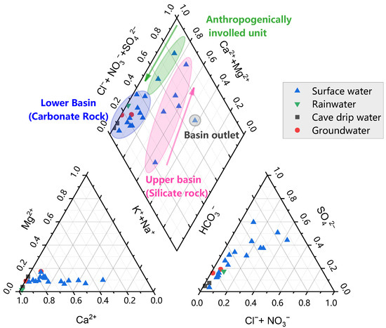On the basis of the ion concentrations results, a Piper diagram (Figure 5) was constructed [34]. Surface water, groundwater, and cave drip water are gathered in the light blue area on the left side, corresponding to the hydrological units within the carbonate rock distribution zone of the mid-lower reaches, indicating that there was a certain degree of interaction between surface water and karst groundwater [35], reflecting that karst processes were the primary controllers of hydrogeochemical processes, consistent with related studies in the Lijiang River basin [36]. Units from the upstream silicate rock were denoted in the red area on the right side of the diagram. In contrast to the carbonate rock units, a significant rise in the Na+ concentration was observed, indicating the primary impact of granite over limestone on the hydrochemical composition of the basin. Additionally, along the runoff path, there was a significant rise in the proportions of Cl−, NO3−, and SO42− ions, as indicated by the red arrows in Figure 5, indicative of a leaching effect. For the hydrological unit at SW04, located downstream, ion concentrations were markedly higher than in other units due to industrial influences. As surface water and groundwater continuously converge along the runoff pathway, the river’s hydrochemical components exhibited a notable dilution effect, signified by the green arrow in Figure 5. Similar dilution phenomena were reported occurring in scenarios characterized by upstream anthropogenic inputs and the confluence of surface and subsurface runoff as the river flowed downstream [37]. Influenced by the mixing of runoff, the hydrochemical evolution of this anthropogenically impacted unit trends towards the blue area indicative of the carbonate rock zone (Figure 5). The concentration of Na+ was the highest at the outlet (SW02), which was speculated to be affected by the high intensity of anthropogenic discharges and the water regulation of downstream reservoirs.