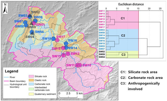 In order to define the extent of anthropogenic impacts on the hydrochemical components of different hydrological units, HCA was employed in the analysis. The method groups samples on the basis of the degree of similarity of multiple hydrochemical parameters from different samples, demonstrating homogeneity within groups and heterogeneity between groups. It is a well-established method for examining the relationships and distribution patterns within hydrogeochemical datasets [42,43,44,45]. The outcomes of the HCA are depicted in Figure 7. A Euclidean distance threshold of 15 was utilized to segregate the samples into three distinct clusters, labeled C1, C2, and C3, with samples within the same cluster denoted by identical symbols in the figure. Cluster C1 predominantly mirrored the hydrogeochemical processes and mixing dynamics within the silicate rock regions, encompassing samples SW01, SW10, SW11, SW12, SW13, SW15, and SW17. SW01 and SW17 were situated in the downstream and midstream regions of the carbonate rock distribution area, respectively. Their positioning led to mixing with surface water from the upstream silicate rock area, which in turn imparted certain characteristics of the silicate rock surface water to their chemical profiles. Cluster C2 predominantly represented the hydrogeochemical processes and the effects of mixing occurring within the downstream carbonate rock watersheds. This cluster encompassed samples SW03, SW06, SW07, SW08, SW14, SW16, and SW18. The samples in C1 and C2 showed significant correlation between stratigraphic lithology and spatial distribution of hydrological units. C3 was the mixing of anthropogenic impacts and hydrogeochemical processes in the watershed, and contained samples SW02, SW04, and SW09. Notably, SW04 and SW09 were situated within the same hydrological unit. SW02 represented the confluence of the tributary with the main river flow within this hydrological unit. The principal outlier ions for C3 were highlighted by elevated concentrations: Na+ in SW02 at 3.220 mmol/L, accompanied by SO42− at 1.707 mmol/L; SW04 exhibited Na+ at 1.263 mmol/L, SO42− of 3.417 mmol/L, and additionally high NO3− levels at 2.405 mmol/L; and SW09 showed Na+ at 0.839 mmol/L and SO42− at 2.028 mmol/L.